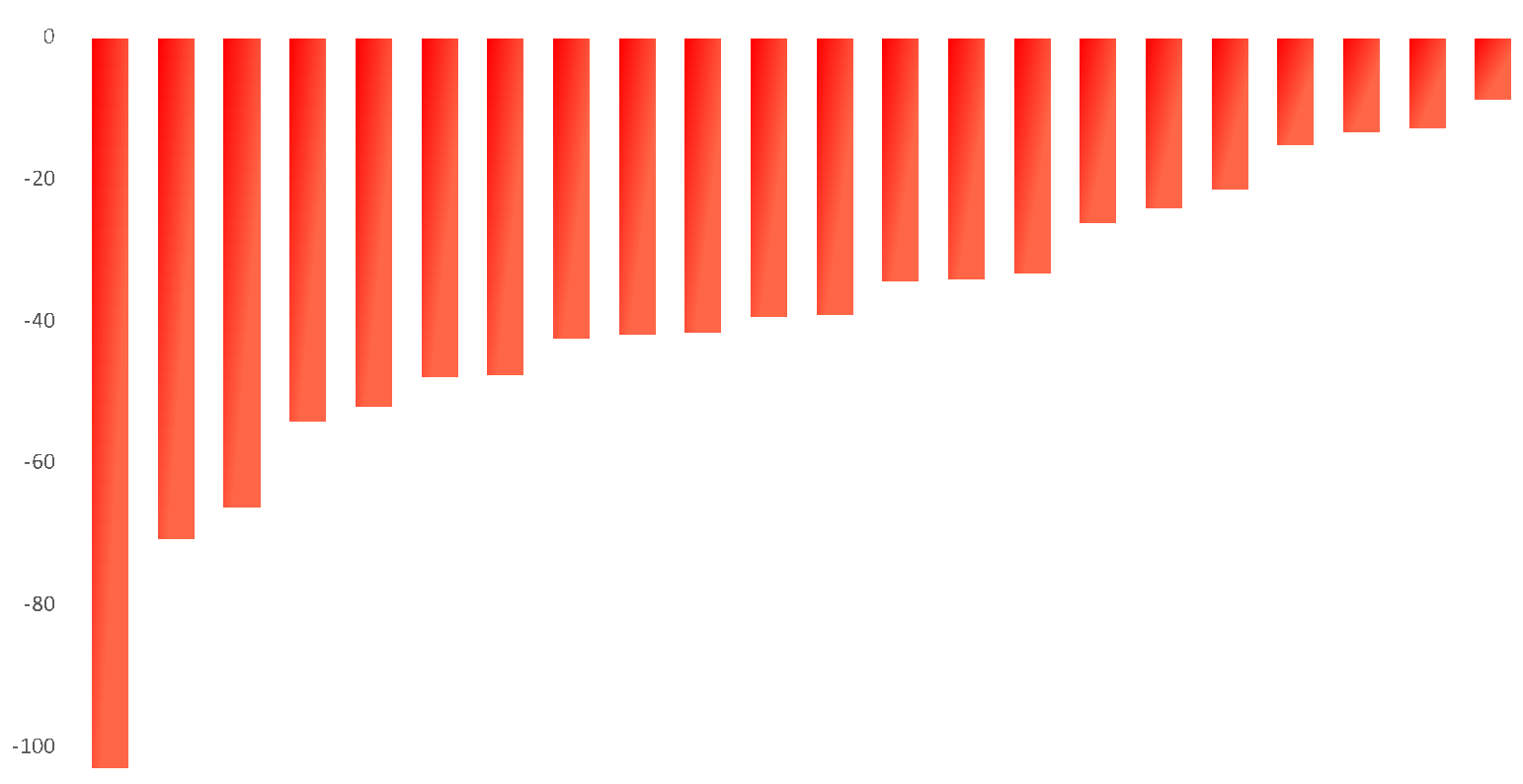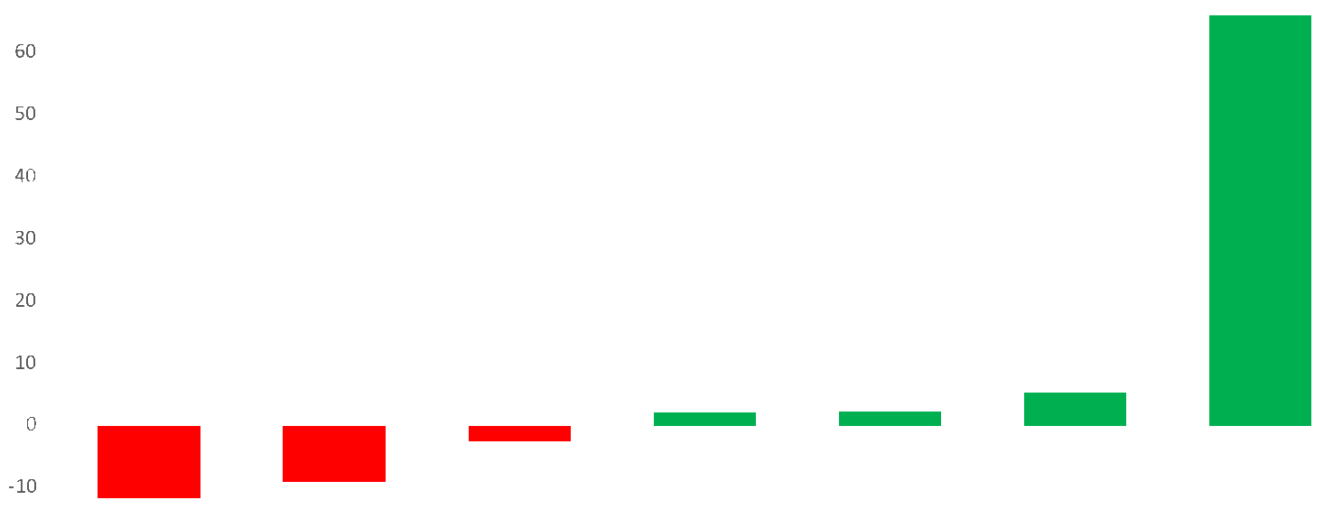 For de fleste er pusteøvelser svært positivt. Stolpene viser fordeling av pusteøvelser fra ulike brukere i ulike grupper. De grønne stolpene viser pusteøvelser med restitusjon, de røde viser stress. Jo lengre stolpene er jo større er effekten.