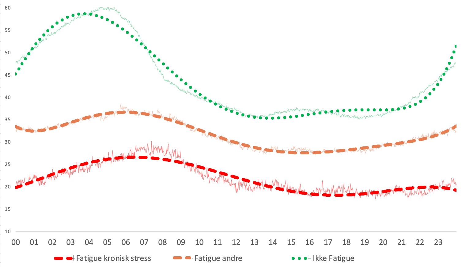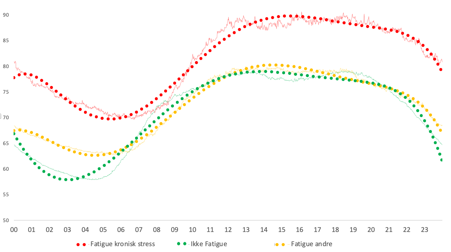 Fatigue vil typisk medføre høyere puls om natten enn det friske har. Det virker som brukere med fatigue kan deles i to grupper, der den ene har betydelig høyere puls om natten enn den andre. Y-aksen viser puls. X-aksen viser klokkeslett.