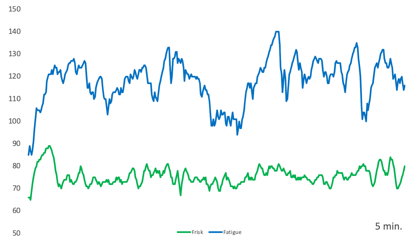 5 minutters rolig gange. Y aksen viser puls. Sammenligning mellom en frisk og en fatigue pasient. . Belastningen er enormt mye større for pasienten.
